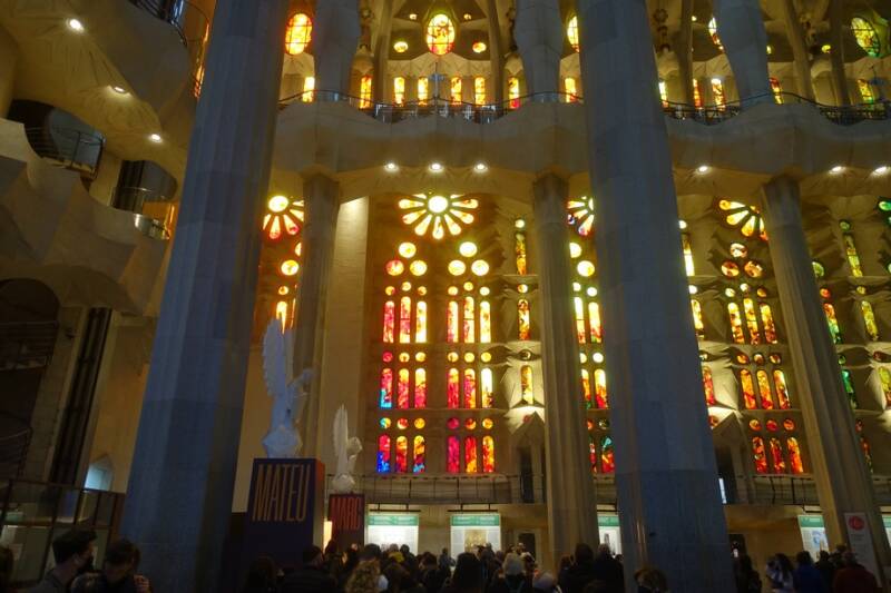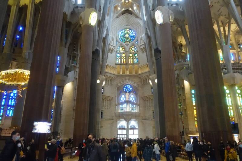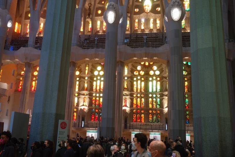Om half tien liepen we met de groep in Barcelona naar de Sagrada Familia. Voordat we naar binnen mochten was er een grondige veiligheidscheck. Tassen door de scan, jassen uit en riemen af. Gelukkig mochten we allemaal door.