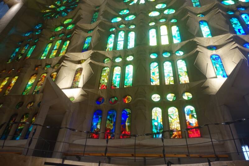 Van binnen is evengoed heel mooi door het vele glas in lood in verschillende kleuren en de prachtige pilaren die gemaakt zijn als bomen. Vandaag was het donker maar als de zon schijnt weerspiegelen de verschillende kleuren op de pilaren.