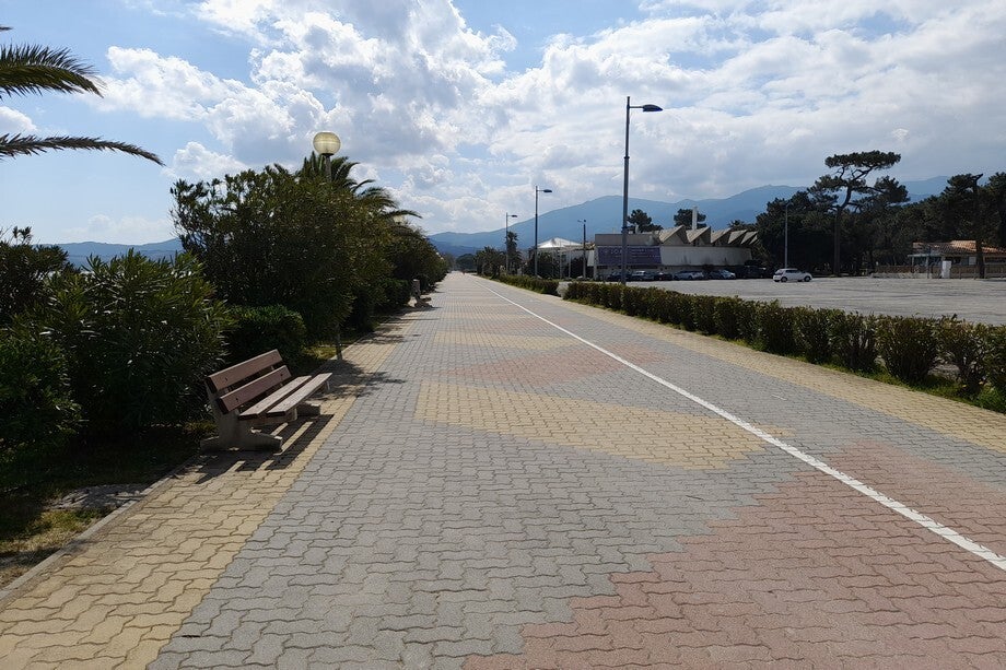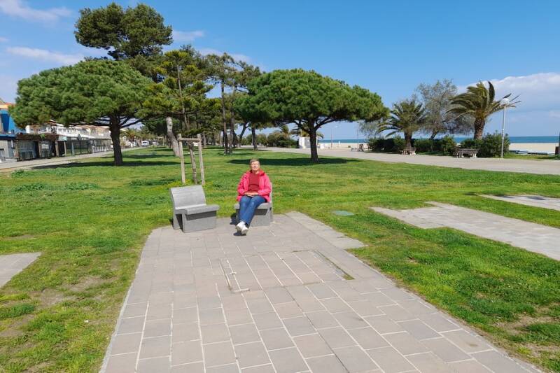 Langs de boulevard en de haven en toen omhoog naar het park Valmy bij het kasteeltje boven Argeles. Vorige keer dat we er waren, in september, bloeide er meer dan nu maar het uitzicht blijft mooi.