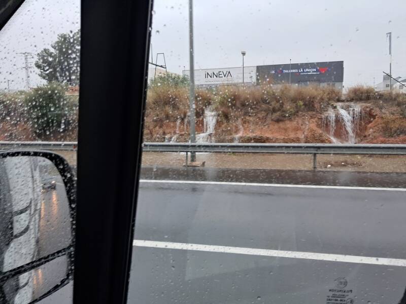 Zaterdagmorgen reden we weg in de stromende regen, dat bleef zo tot voorbij Valencia. Daar hadden we nog geluk, een kilometer voor onze afslag moesten alle auto’s ineens naar de meest linker rijbaan en die werd geblokkeerd door een politieauto. Die ging gelukkig weer aan de kant en iedereen mocht door maar er liep wel heel veel water over de weg. Het land lag ongeveer een meter hoger dan de weg en het water liep in een soort goot langs de weg maar de goot was vol en het water gutste over de weg over een lengte van 500 meter. De linkerbaan was bijna droog en gelukkig konden we door. Er was ook geen modderstroom zoals bij Tarragonna wat we later lazen.