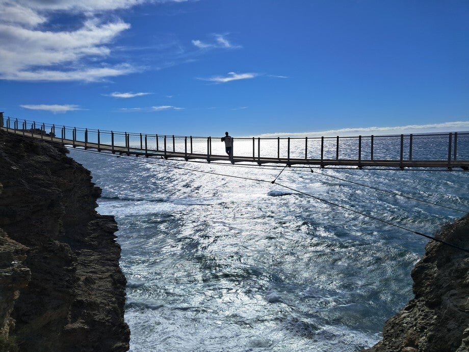 Vanmorgen was het een stuk beter en na een bakje koffie in de zon zijn we aan de wandel gegaan. Naast de cp liggen hoge rotsen en daarachter is de zee. via trappen kun je naar boven en daar lopen paden en over een kloof hangt een heuse hangbrug. In het midden zit een glasplaat en kun je zo naar beneden in het water kijken, spannend om daar over heen te lopen.