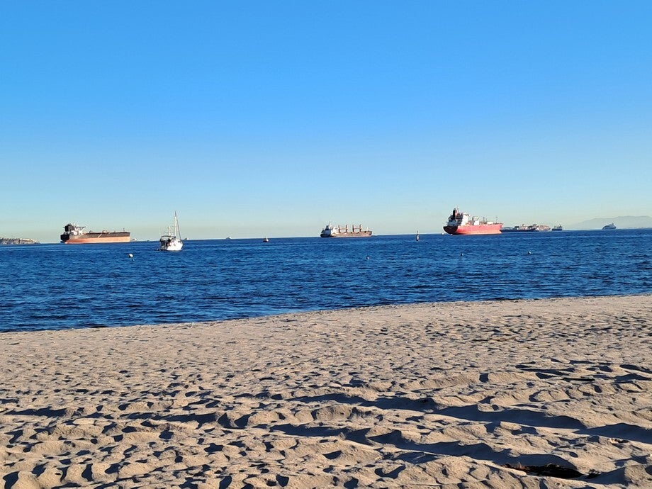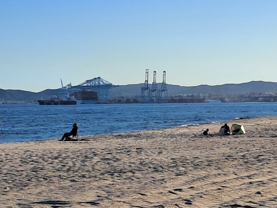 Na een bakje koffie, in de zon, en een paar boodschappen bij de Lidl zijn we nog even aan de wandel gegaan. Op Googlemaps hadden we gezien dat het strand vlakbij is, op anderhalve kilometer lopen en dat klopte. Met 20 minuten stonden we op het strand. Het is niet een mooi strand, tussen twee havens in, aan de ene kant heb je zicht op Gibraltar en aan de andere kant op de haven waar morgen de ferry vertrekt. Dat is dan wel weer leuk! Er lagen ook veel boten te wachten voor de haven.