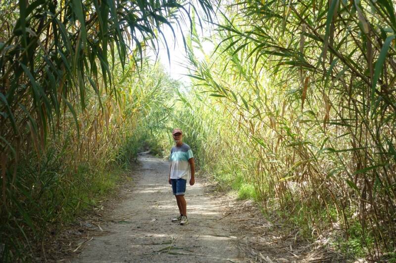Langs de route staan informatieborden over de begroeiing en het irrigatiesysteem dat hier en daar zichtbaar is. De amandelboompjes op het bord bloeiden mooi, die foto is waarschijnlijk in februari genomen.