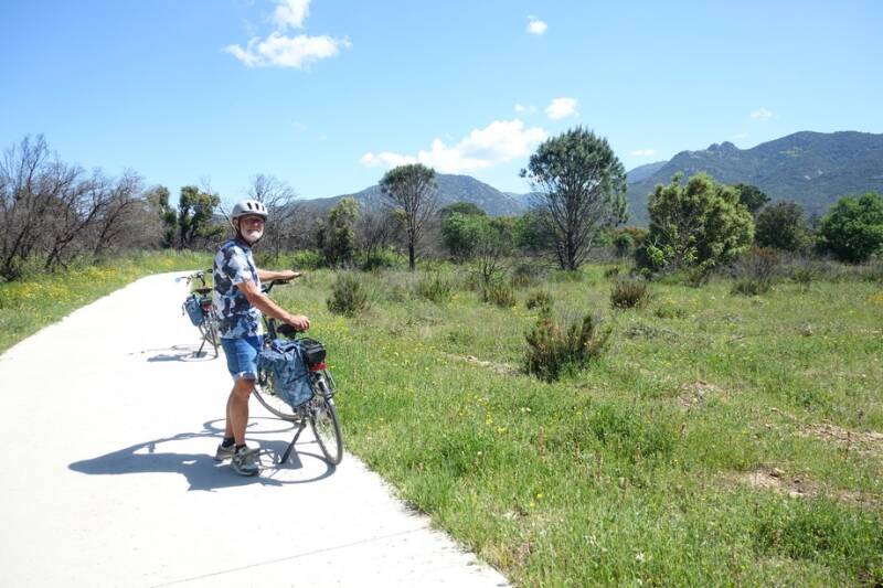 We zijn teruggefietst over een lager gelegen fietspad dat slingerend door het groen met veel bomen en bloemen weer naar Argeles voert.