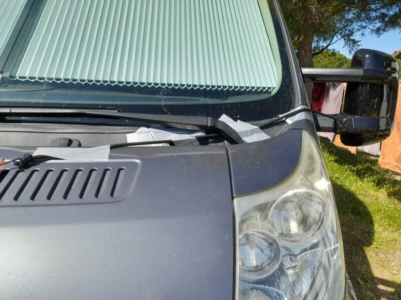 De rit hier naartoe verliep niet helemaal vlekkeloos. Af en toe waren er flinke rukwinden en na een half uurtje rijden klapte de buiten- spiegel aan de chauffeurskant in. Met de steel van een houten lepel kon Cor er net bij om hem terug te duwen maar 5 minuten later was het weer raak. Zonder spiegel kun je niet rijden, inhalen gaat natuurlijk helemaal niet dus bij de eerste P zijn we de weg afgegaan. We hebben de spiegel vast gezet met een elastieken spin waar je anders dingen mee achter op de fiets bindt. Na een bakje koffie ging de rit weer verder en de spiegel bleef gelukkig mooi op zijn plaats! Voor nu opgelost, wordt thuis waarschijnlijk een nieuwe.