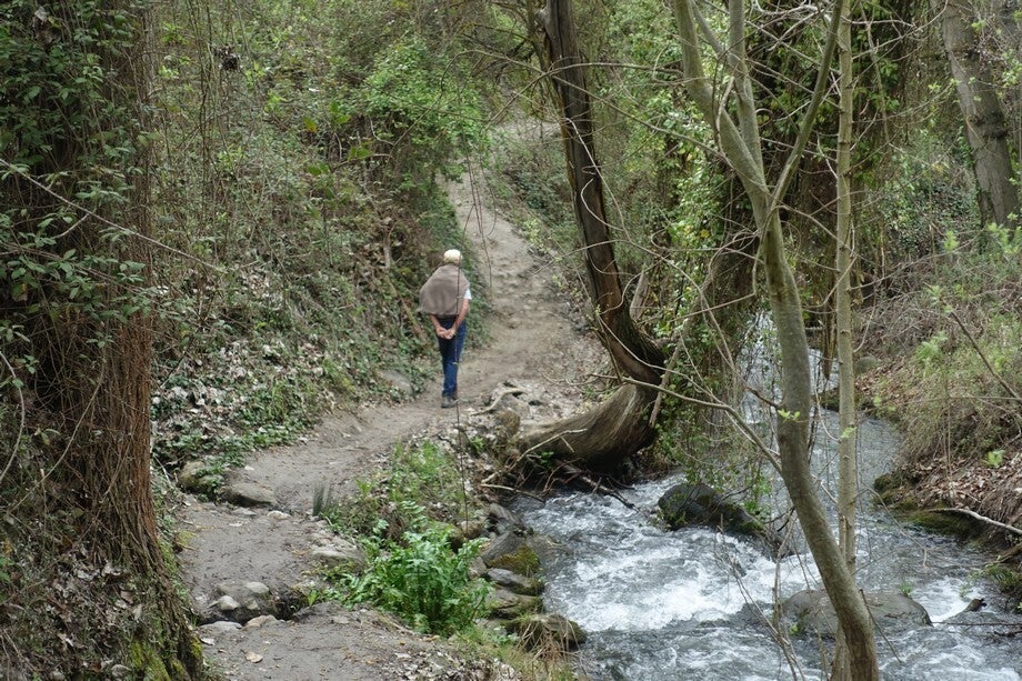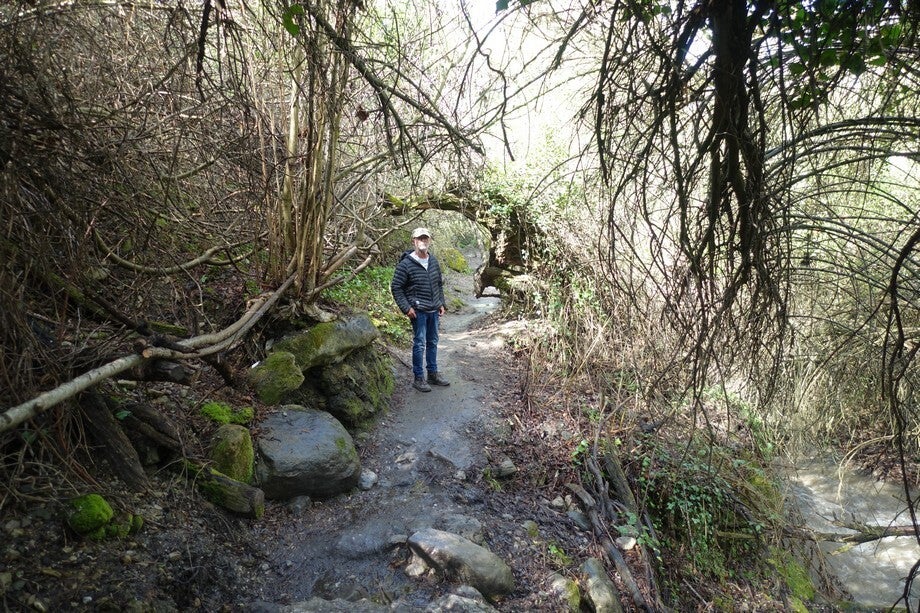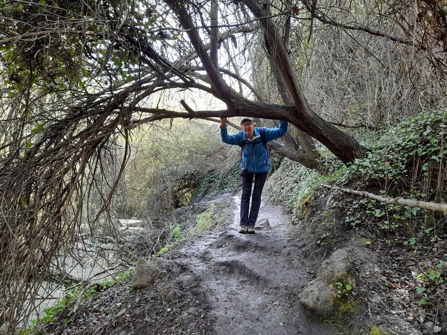 De route ging eerst over een weggetje hoog boven de rivier door een lieflijk dal. Na ongeveer anderhalve kilometer ging het pad geleidelijk naar beneden tot we bij de rivier kwamen. Toen was het nog een kleine kilometer klauteren en glibberen langs de rivier tot de eerste hangbrug.