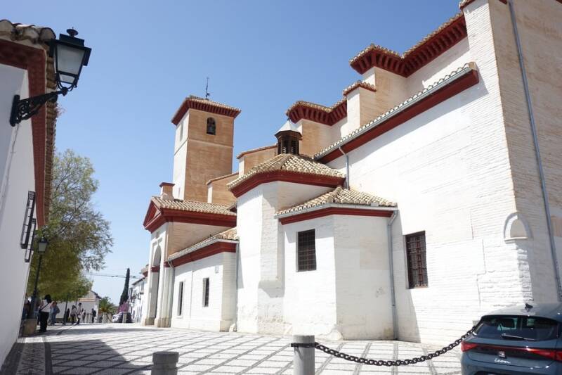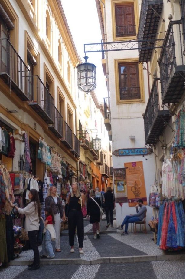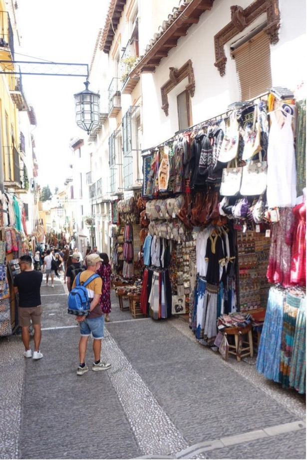 De drukke winkelstraat overgestoken en dan kom je in de kleine straatjes. Hier zijn veel kleurrijke winkeltjes. Later via “witte straatjes” naar boven langs verschillende uitkijkpunten. Op het Plaza Larga hebben we lekker geluncht bij een pizzeria. Daarna vonden we bij een mooie kerk San Nicolas het gelijknamige uitkijkpunt op het Alhambra waar we zondag naar hadden gezocht. Toen liepen we in een hele andere wijk, nl. de Joodse wijk Realejo.