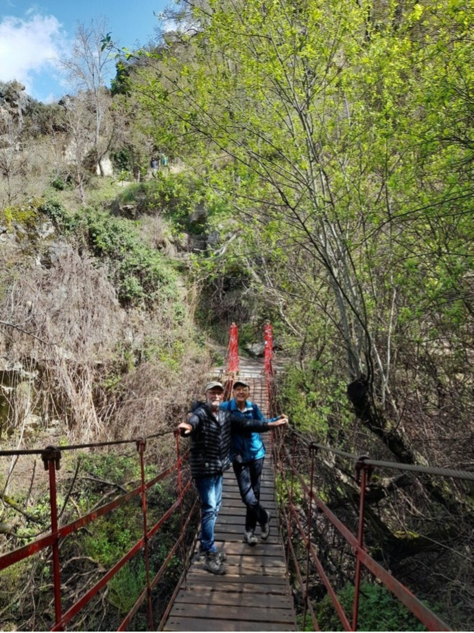 Vlakbij dit punt begint ook de vierde en langste hangbrug, 63 meter, hoog boven de rivier. Na deze brug worden de rotsen erg stijl en het pad smal dus na een poosje zijn we omgekeerd. Ik, Wil, durfde niet verder.