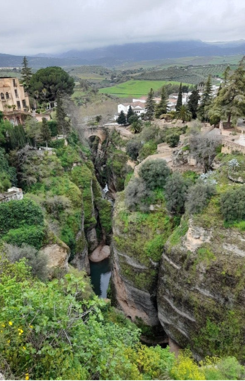 Als je naar beneden loopt kom je vanzelf weer bij de oude brug uit. Het pad aan de noordkant langs de kloof was nu open. Als je daar loopt zie je ook een oud geel paleis. Hier wilden we heen. Dit huis is gebouwd in de 18e eeuw. Daarvoor stond er een paleis van de Moorse koning Almonated, dit was in de 11e eeuw. Deze koning had onder zijn huis een geheime trap, La Mina, van 365 treden uitgehouwen in de rotswand zodat zijn slaven water uit de rivier konden halen.