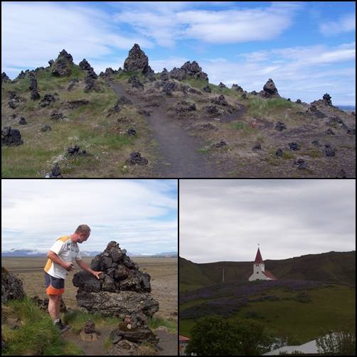 Verderop kwamen we bij Laufskalafordur, een heuveltje met allemaal steenmannetjes. Als je daar voor de eerste keer komt moet je er een steen bovenop leggen, dat brengt geluk. Dat hebben we dus maar gedaan!